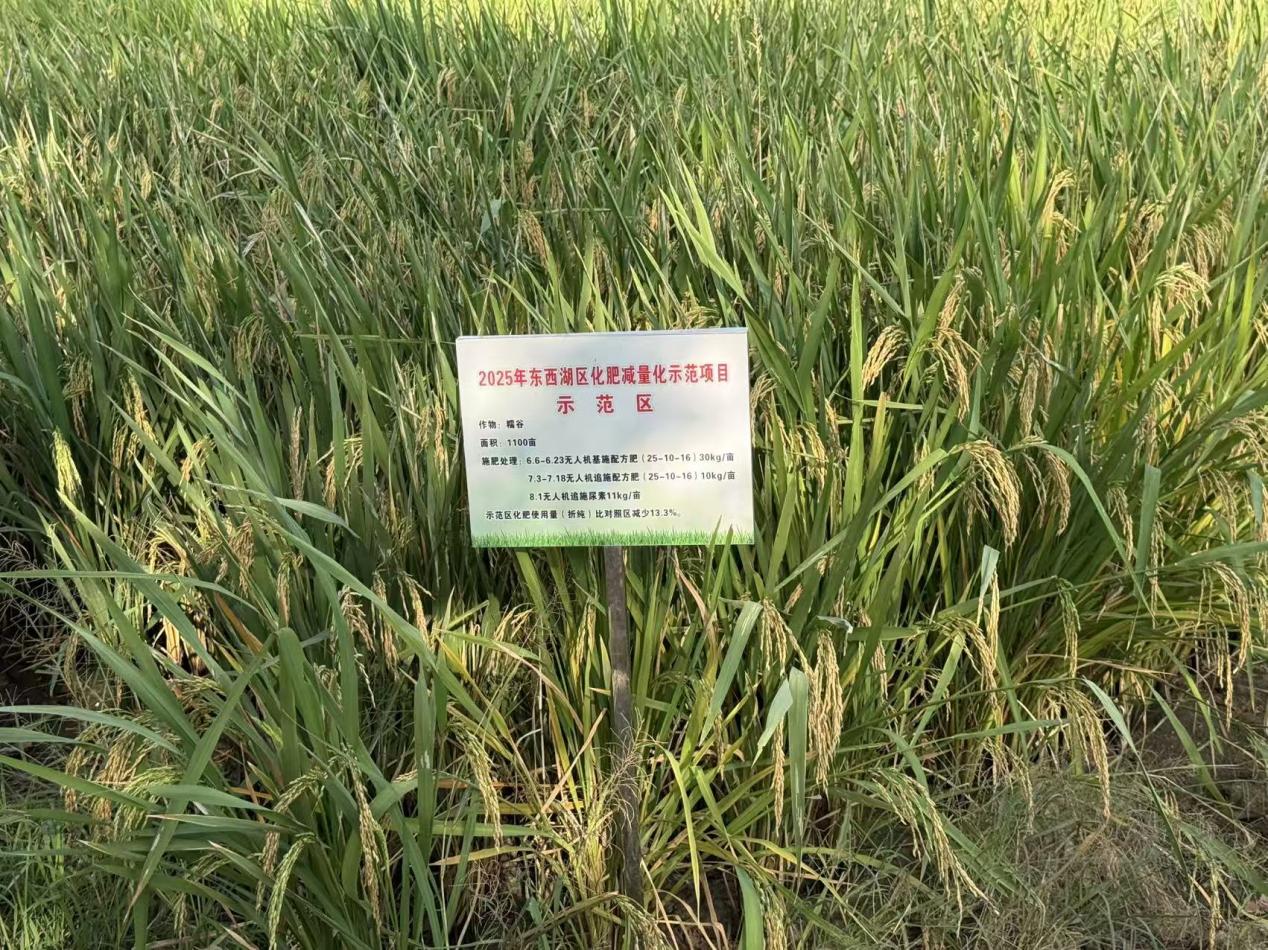 参与观摩人员前往区农投集团公司生产基地,现场观看2025年辣椒化肥减量增效田间试验。在阳雀湖辣椒种植大棚内,辣椒挂满枝头,长势喜人。基地负责人介绍,该基地在辣椒种植全过程中使用有机肥替代化肥,在保证辣椒产量的同时提升了辣椒品质,而且凭借优质的产品赢得了市场认可,目前辣椒销路畅通,呈现供不应求的态势,实现了生态效益与经济效益的双丰收。在柏泉吴张路的2025年糯谷化肥减量化示范区,1100亩水稻已进入成熟季,金黄的稻穗低垂,饱满的谷粒尽显丰收景象。据介绍,该示范区采用了新式分段施肥处理方法:第一阶段基施配方肥30公斤/亩;第二阶段追施配方肥10公斤/亩;第三阶段追施尿素11公斤/亩。实践数据显示,通过这一科学施肥方法,示范区化肥使用量较对照区减少13.3%,而水稻产量与对照区相比无明显差异,真正实现了“减量不减产”的良好效果。