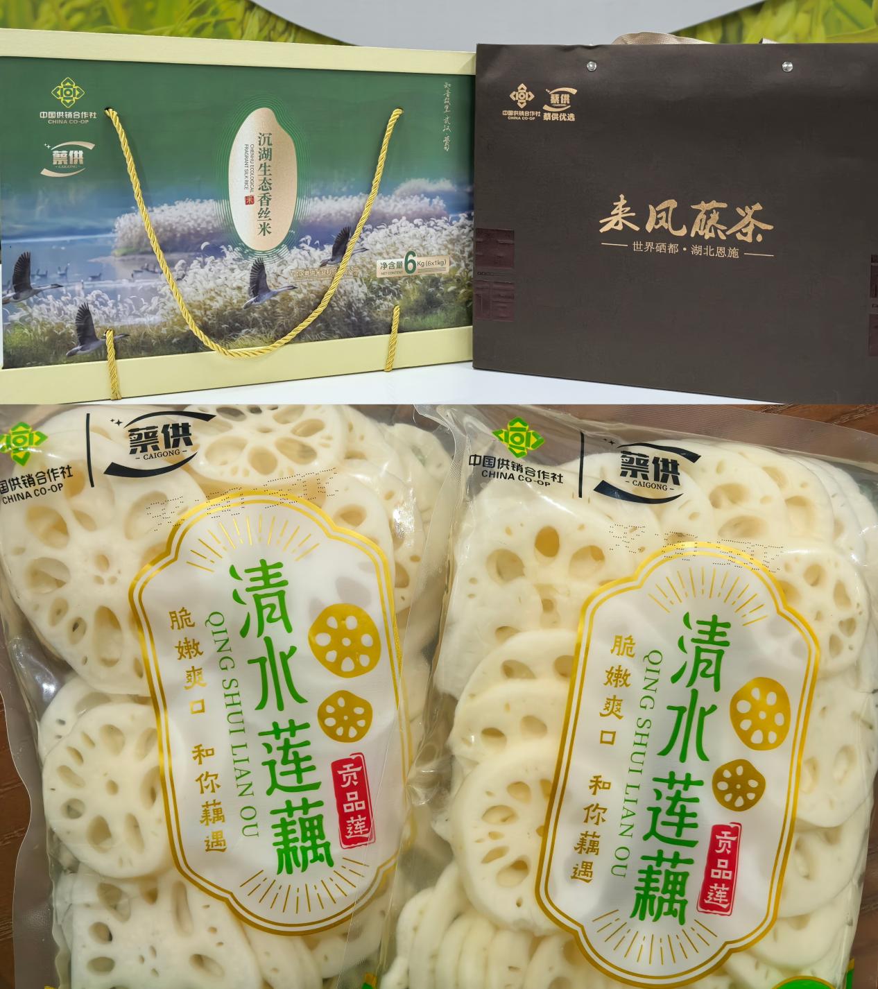一是筑品牌矩阵。以本地特色优质农产品为原材,相继开发“蔡供”“贡莲”“贡品莲”“沉湖生态香丝米”等10余个自有品牌,形成覆盖高端、中端的品牌体系。通过统一品牌形象、设计特色包装、讲述地域文化故事,让农产品从“无牌散卖”向“品牌专卖”转型,显著提升了产品辨识度与美誉度。
