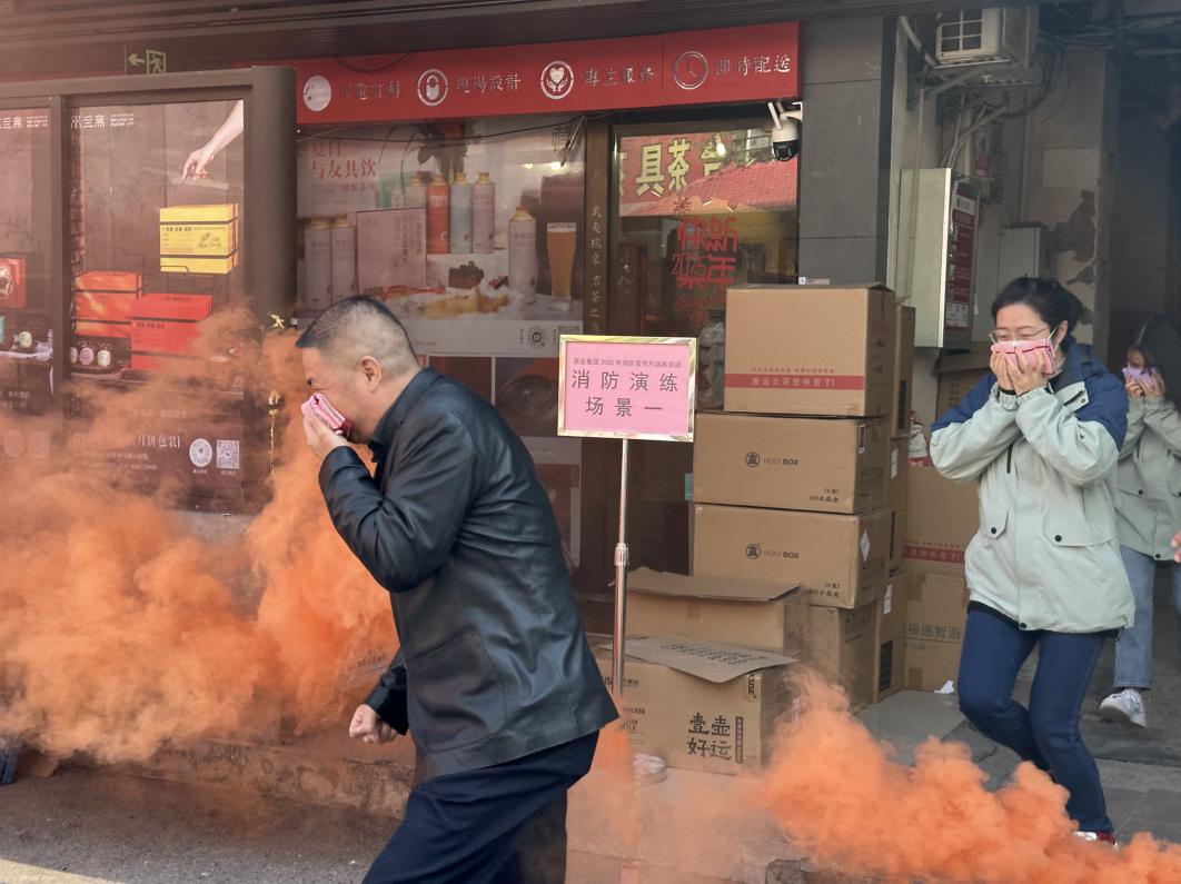 上午10:30,逃生演习准时启动。茶市消防广播系统警报响起,模拟茶市火灾场景,冷库区域人员手持湿毛巾低姿前行,沿安全通道快速撤离至中央广场。整个过程秩序井然,5分钟内完成全员疏散,有效检验了火灾逃生应急预案的可行性。