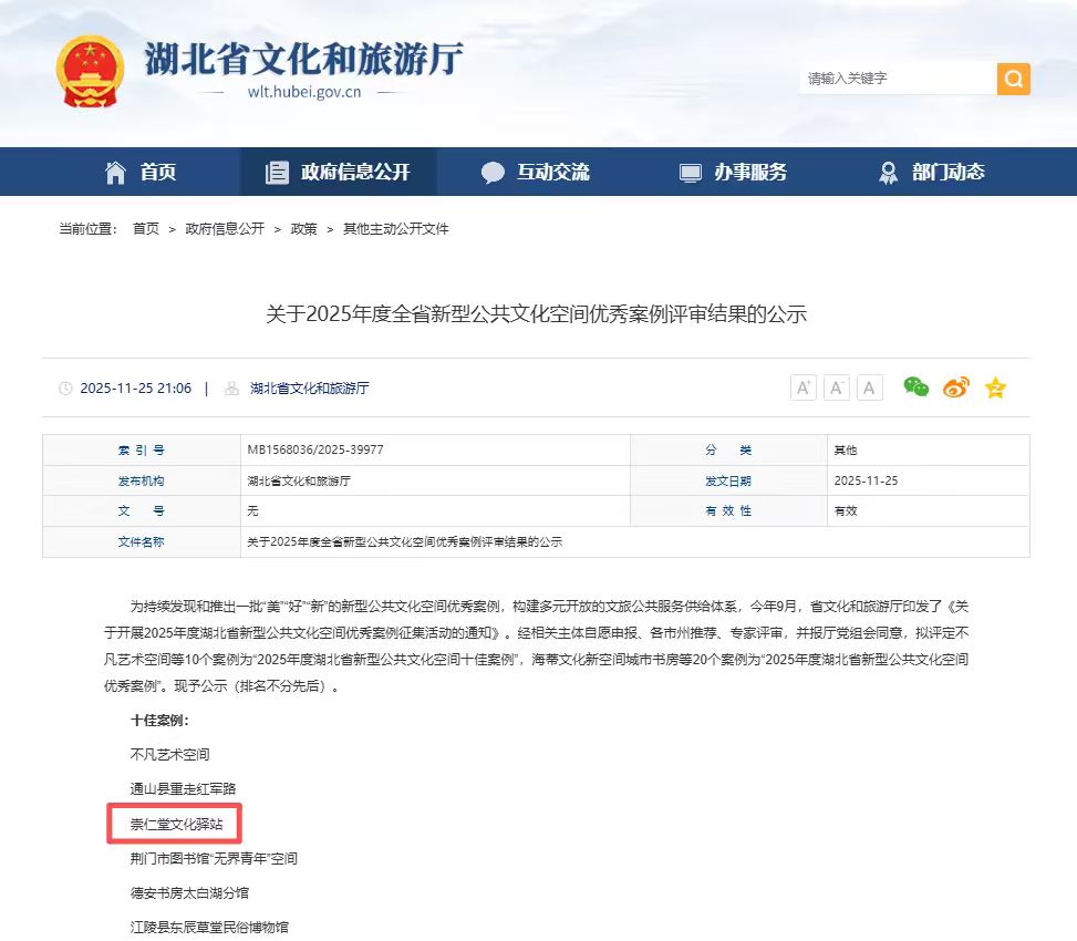 11月25日,湖北省文化和旅游厅公布2025年度全省新型公共文化空间优秀案例评选结果(链接详见湖北省文化和旅游厅官网)。由收藏品市场运营的“崇仁堂文化驿站”凭借创新运营模式与高质量文化服务,从众多案例中脱颖而出,荣获“十佳案例”称号。
