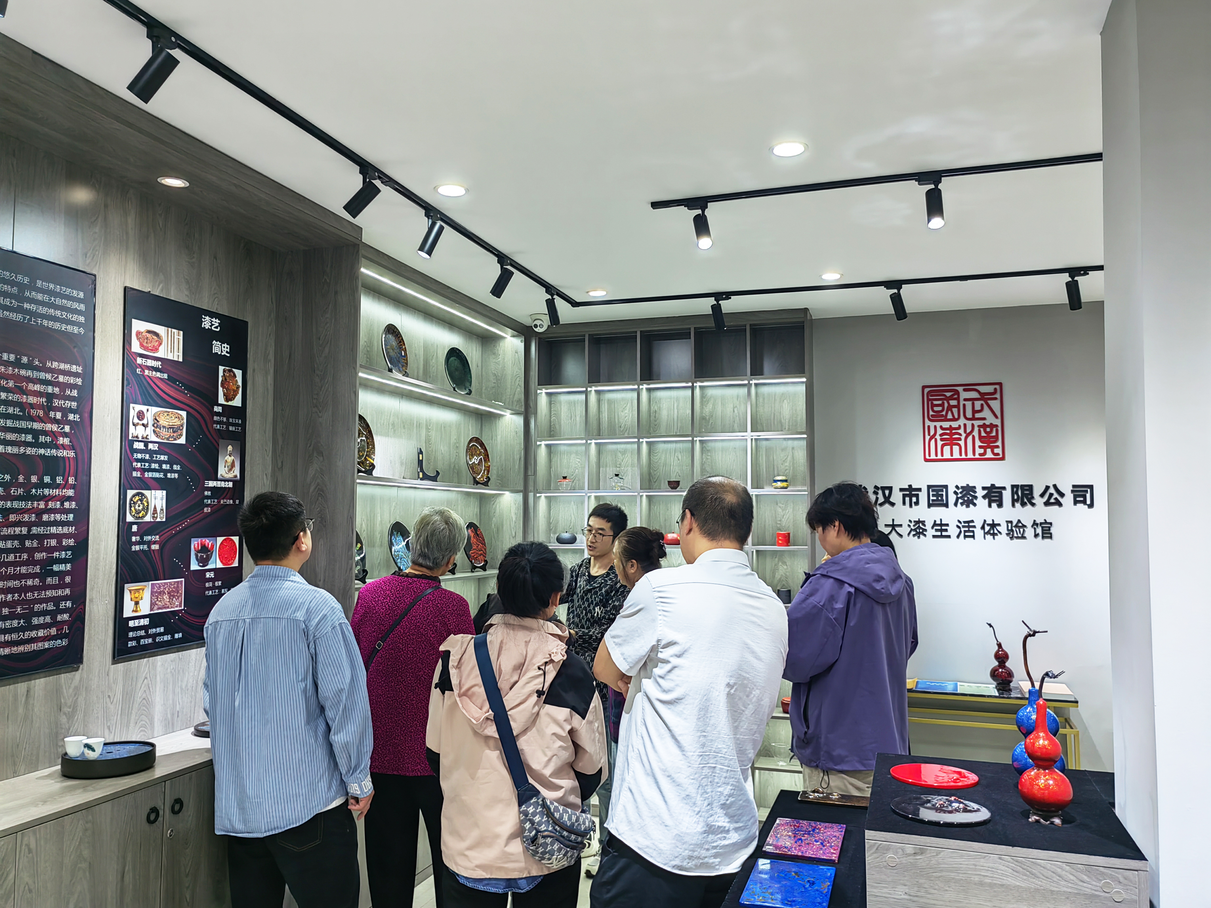 活动当天,同庆阁社区的十余名老党员代表来到国漆公司循礼门门店参观学习。公司工作人员系统讲解了大漆从采割、提炼到制作成型的完整工艺,以及大漆背后的故事,使老党员们直观感受到非遗技艺所承载的匠心精神与文化厚度。