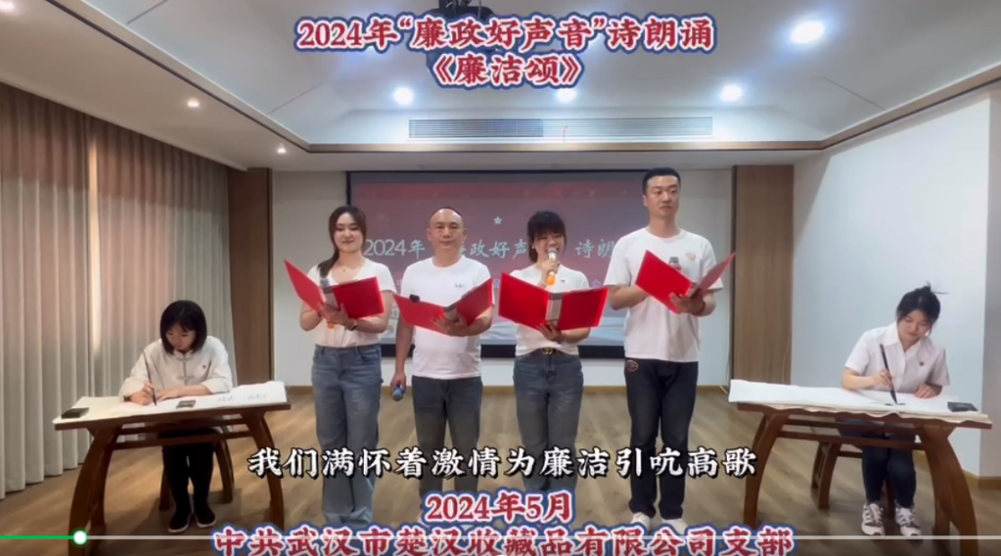 为深入开展党纪学习教育,中共武汉市楚汉收藏品有限公司支部在抓好理论学习的同时,特别策划了一场以“廉政”为主题的活动。本次活动以诗歌朗诵与书法艺术的融合为特色,通过丰富的艺术形式,深刻传达了廉洁文化的核心价值。诗歌《廉洁颂》在朗诵者们的深情演绎下,以铿锵有力的声音,歌颂了廉洁作为为官从政的基石、人民公仆的坚守、正义的化身和光明的使者,进一步增强了全体党员对廉洁文化的认同感,坚定了大家践行廉洁自律的坚定信念。
